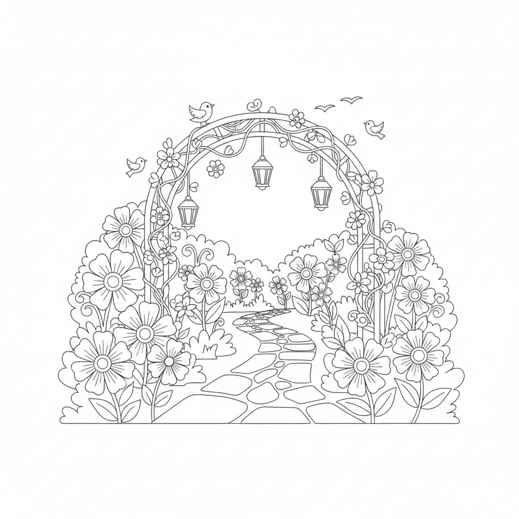 A delightful flower coloring page featuring flower path garden walkway archway. Perfect for kids and adults who love coloring!