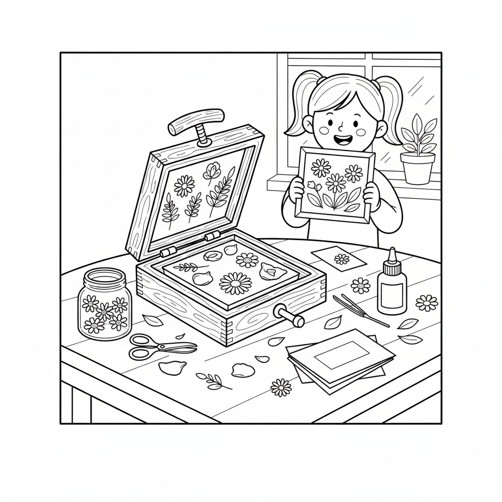 A delightful flower coloring page featuring flower pressing craft scene dried preservation. Perfect for kids and adults who love coloring!