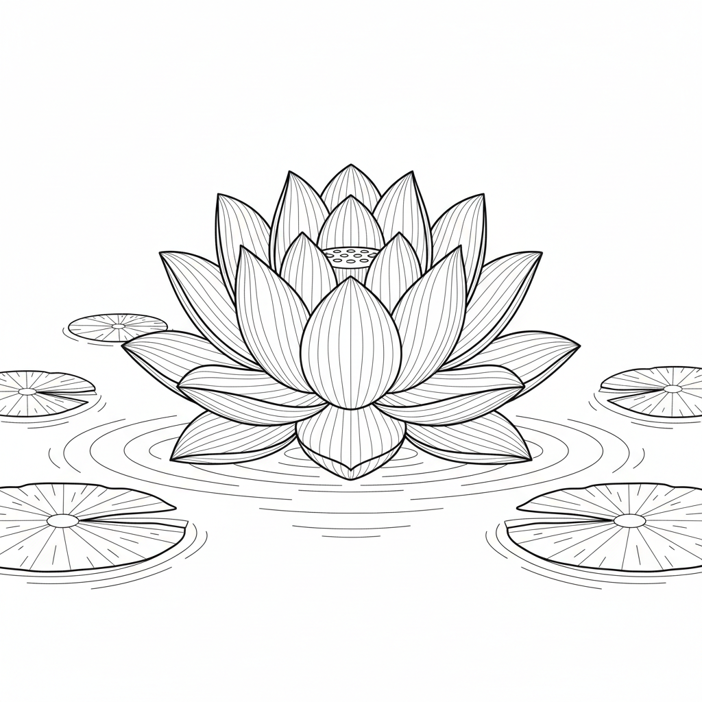Beautiful lotus flower on pond coloring page for kids and adults. Free to download and print.