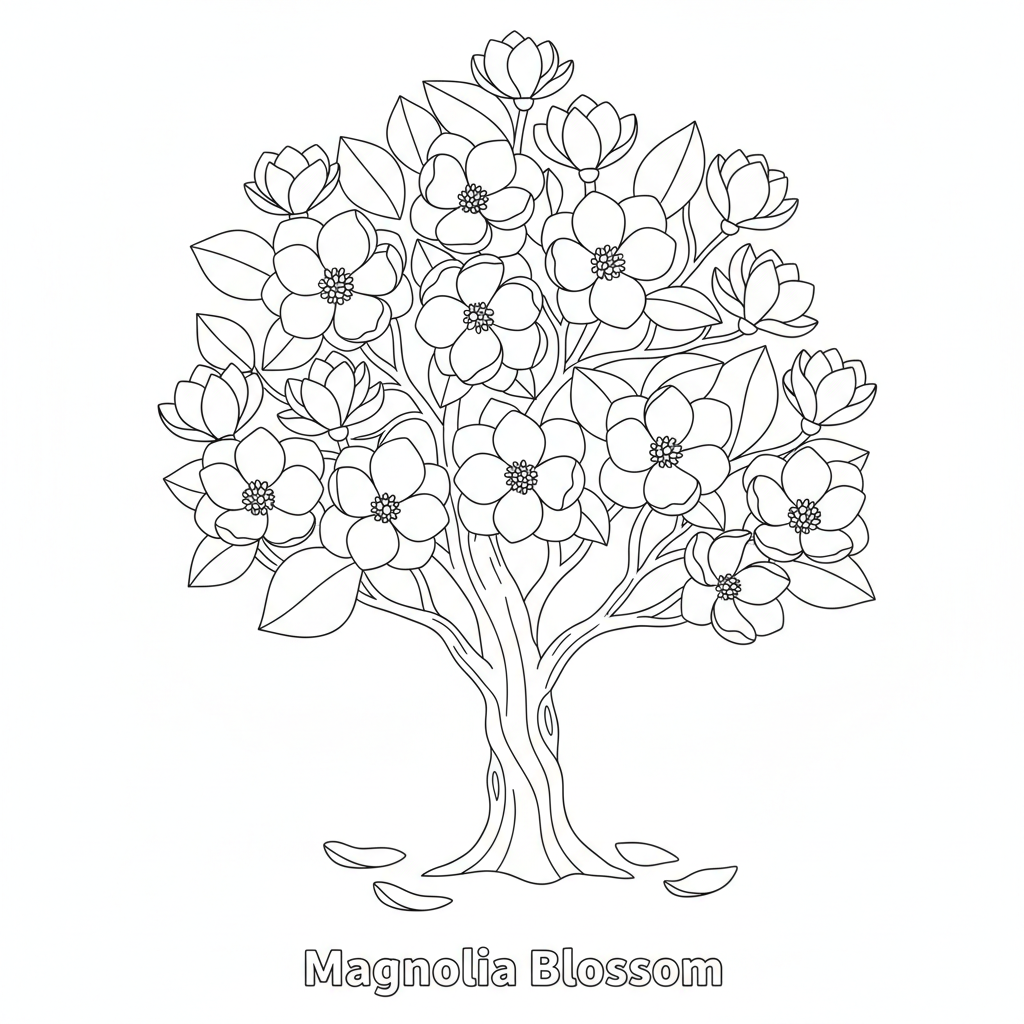 A delightful flower coloring page featuring magnolia tree in bloom fragrant white. Perfect for kids and adults who love coloring!