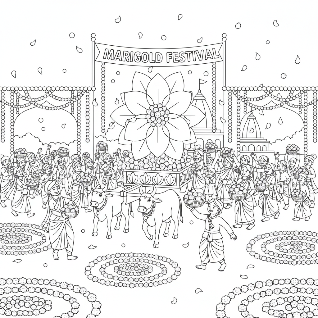 A delightful flower coloring page featuring marigold festival celebration orange gold. Perfect for kids and adults who love coloring!