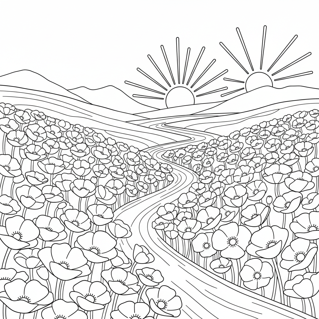 A delightful flower coloring page featuring poppy field landscape red flowing. Perfect for kids and adults who love coloring!