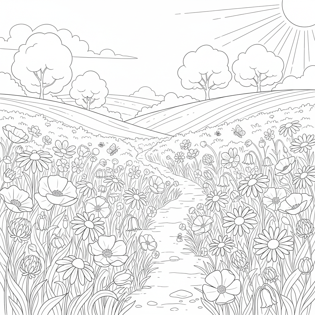 Beautiful wildflower meadow scene coloring page for kids and adults. Free to download and print.