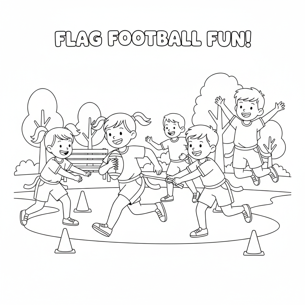 A delightful football coloring page featuring children playing flag football in park having fun together. Perfect for kids and adults who love coloring!