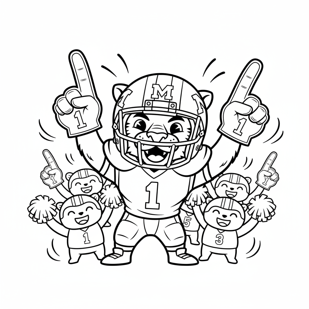 A delightful football coloring page featuring football mascot character cheering with foam finger fans. Perfect for kids and adults who love coloring!