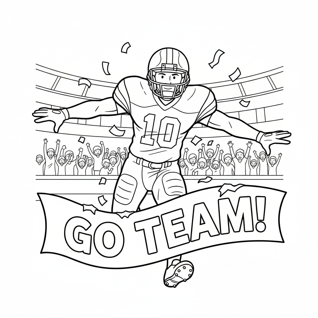 A delightful football coloring page featuring football player running through paper banner team entrance. Perfect for kids and adults who love coloring!