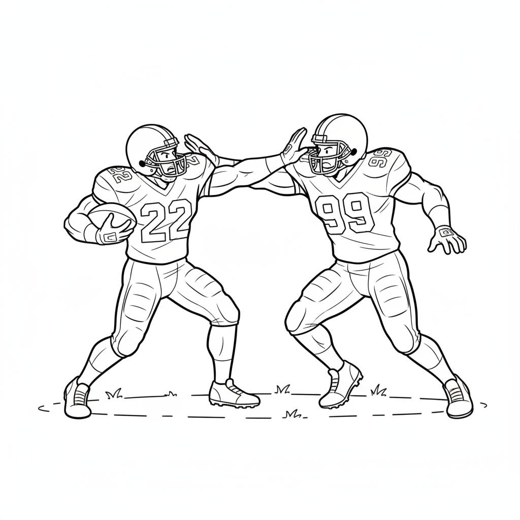 A delightful football coloring page featuring football player stiff-arming defender while running ball. Perfect for kids and adults who love coloring!