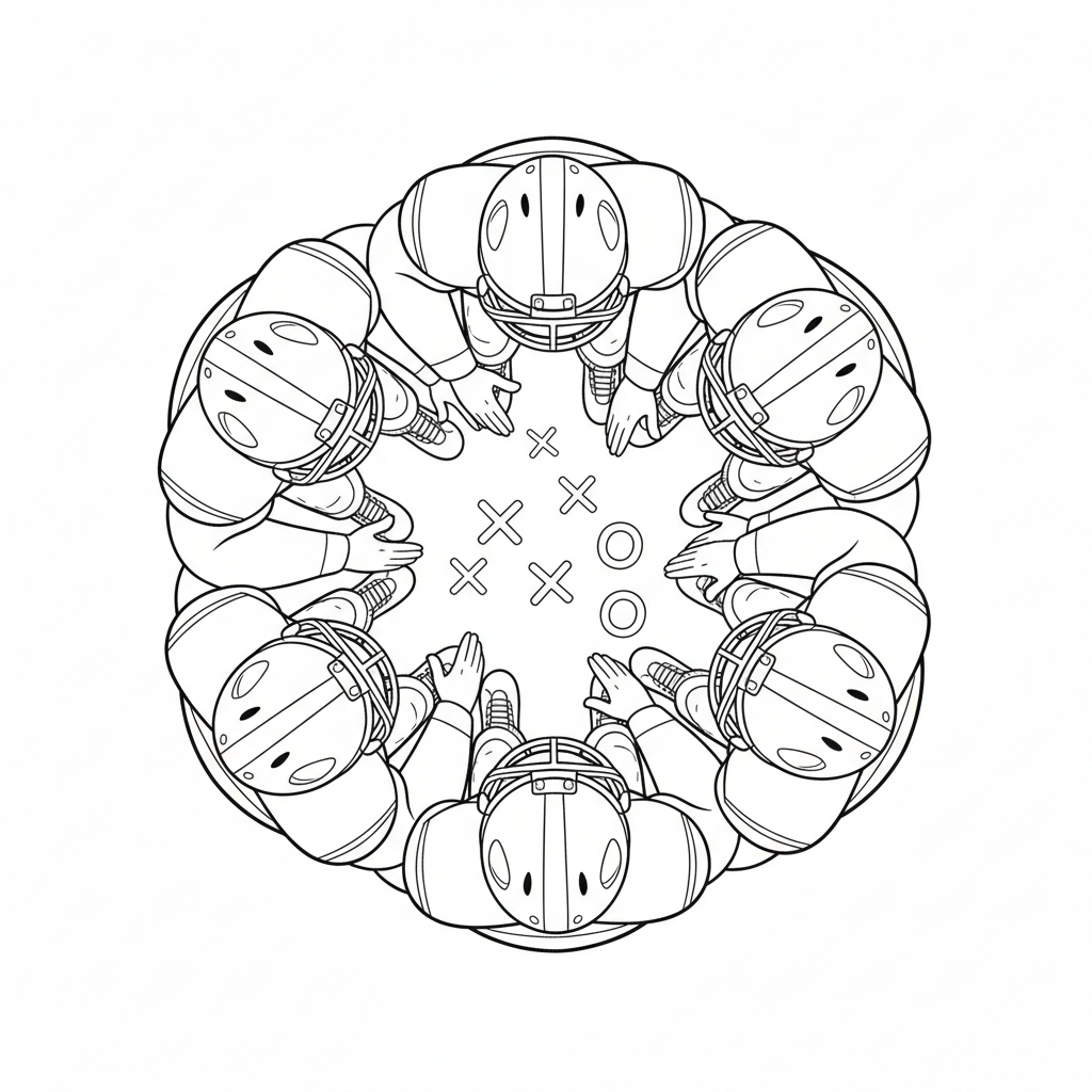 A delightful football coloring page featuring huddle of players from above planning next play together. Perfect for kids and adults who love coloring!