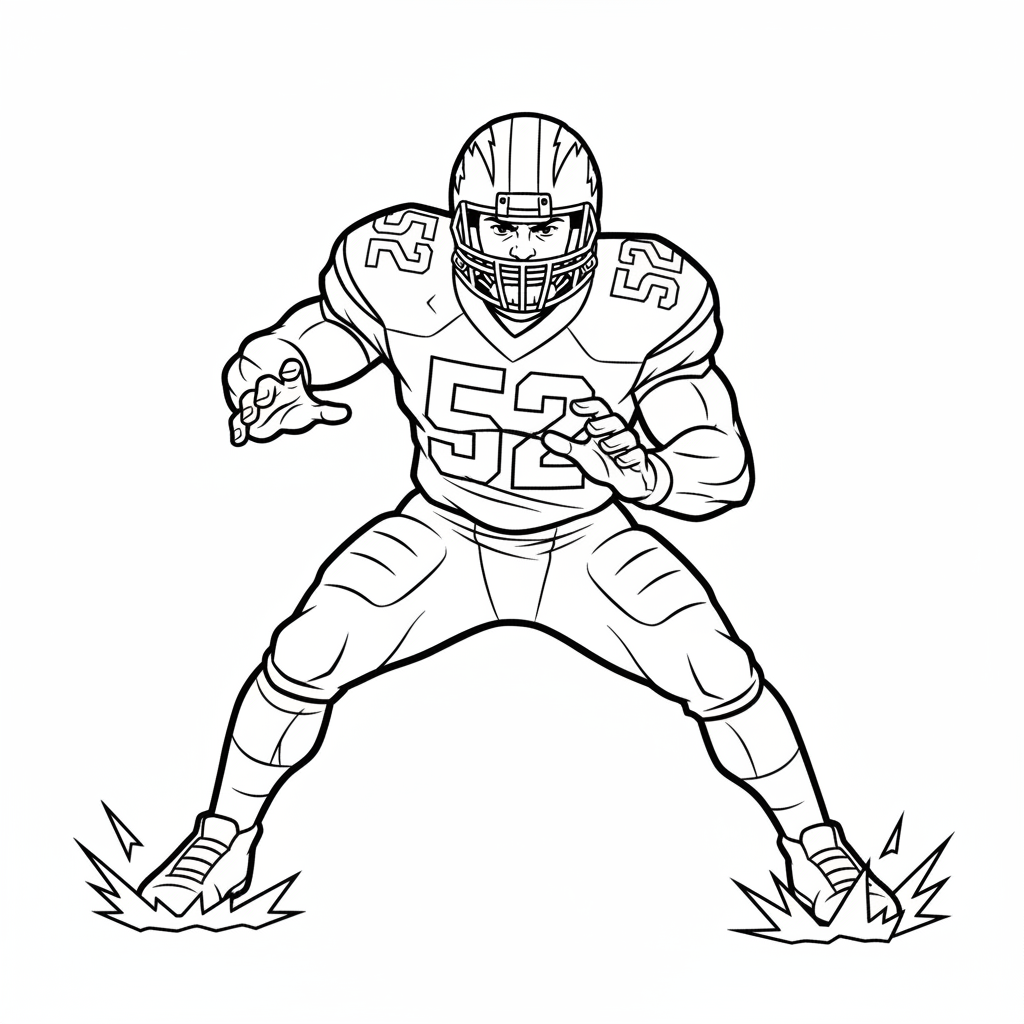 A delightful football coloring page featuring linebacker in powerful tackling stance ready to blitz. Perfect for kids and adults who love coloring!