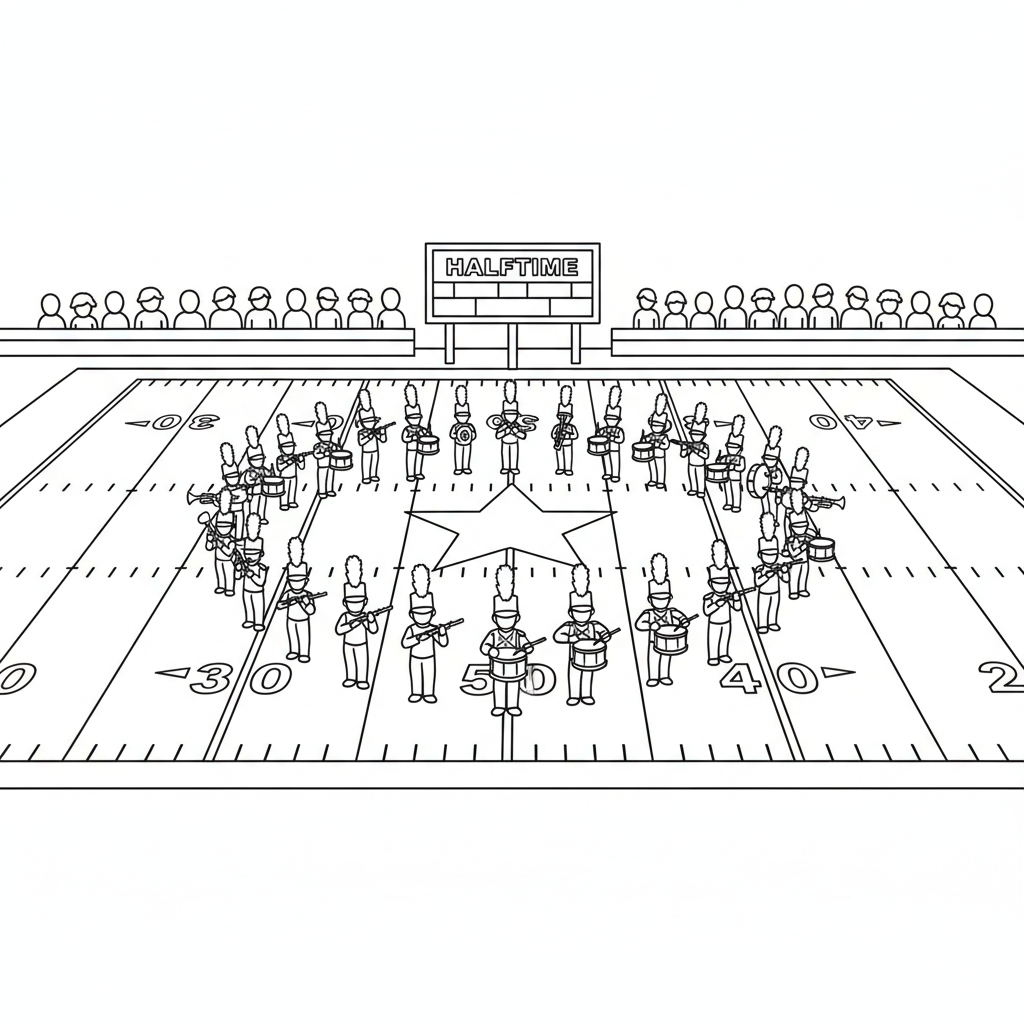 A delightful football coloring page featuring marching band performing halftime show on football field. Perfect for kids and adults who love coloring!