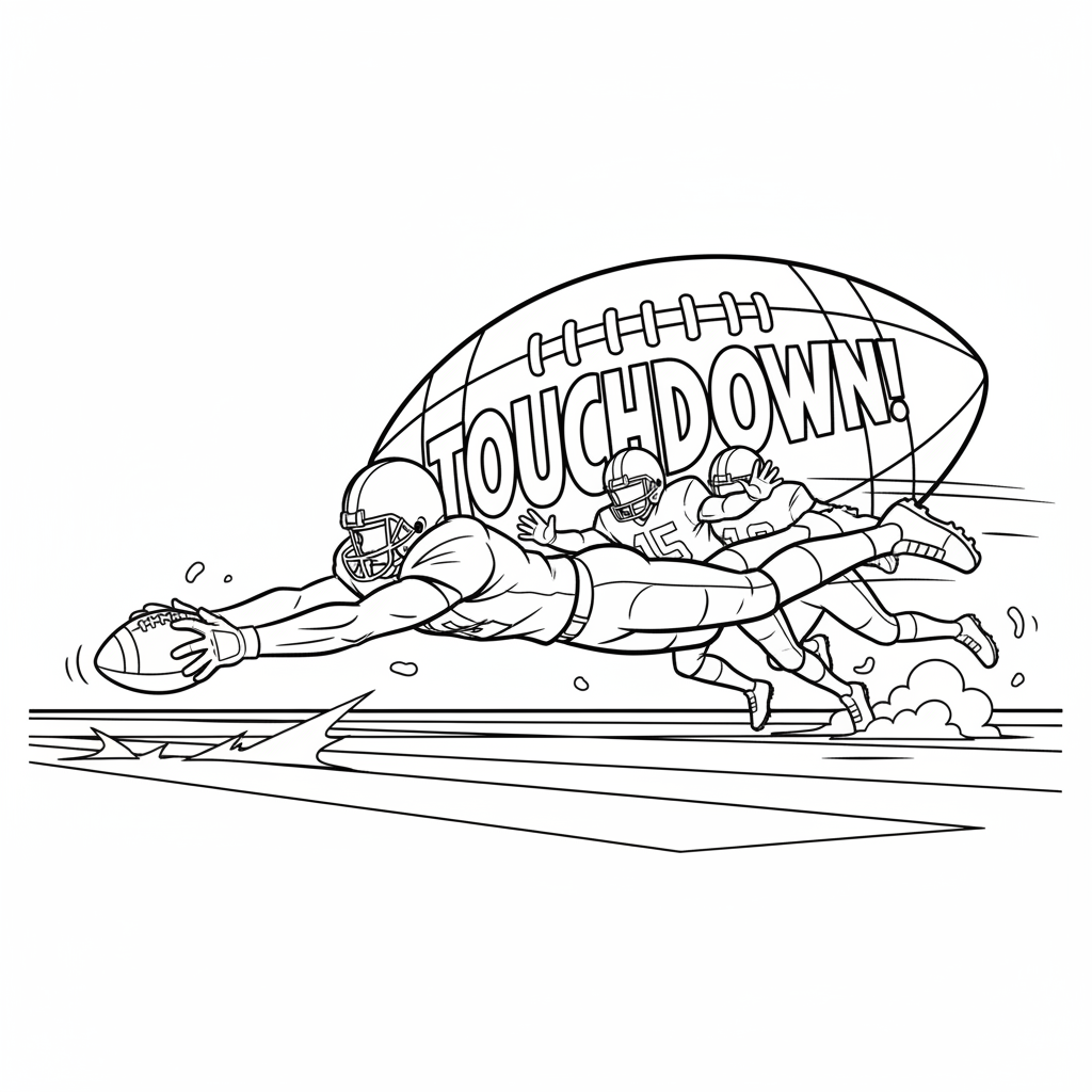 A delightful football coloring page featuring player diving across goal line for dramatic touchdown score. Perfect for kids and adults who love coloring!