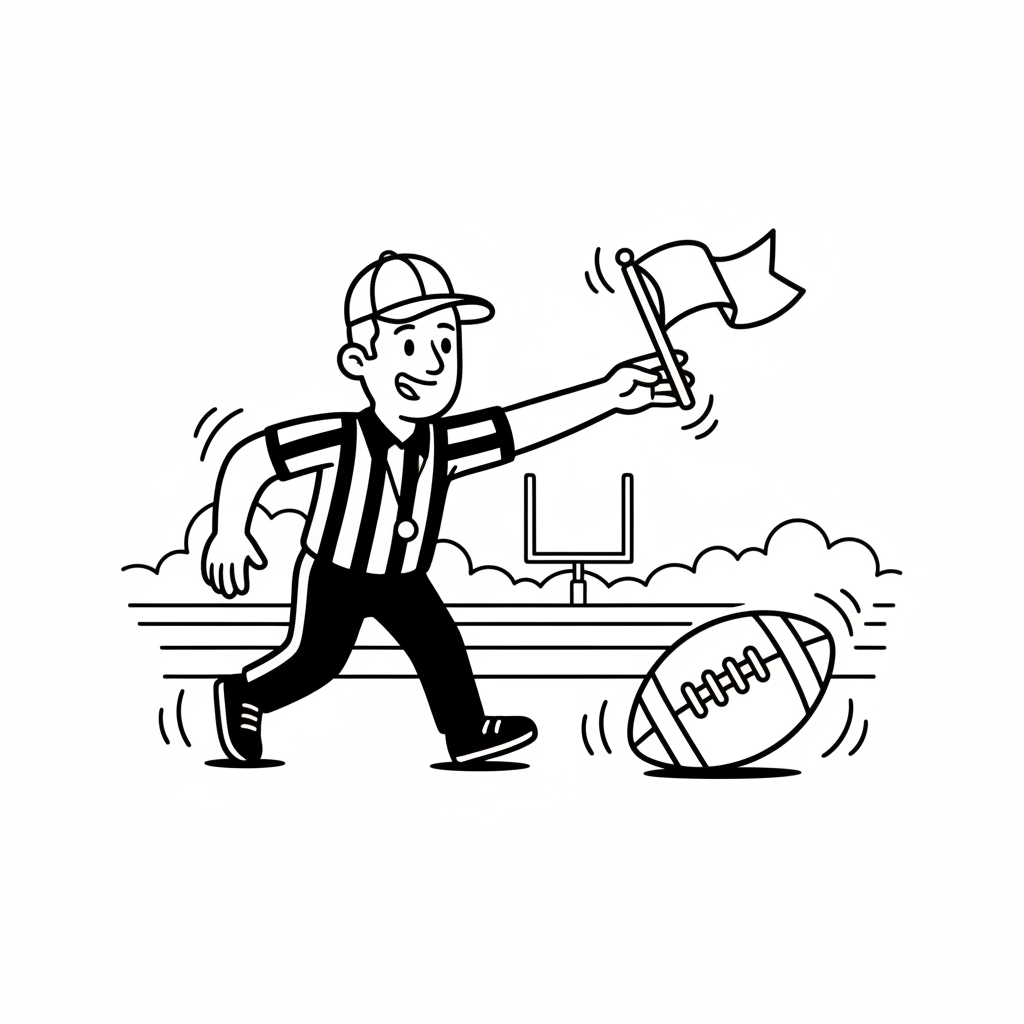 A delightful football coloring page featuring referee throwing yellow penalty flag on field call. Perfect for kids and adults who love coloring!