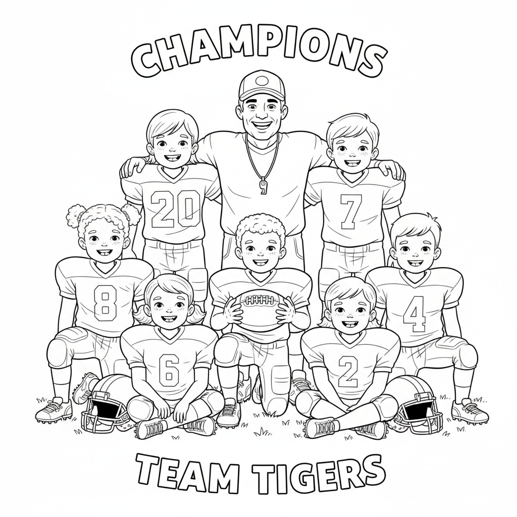 A delightful football coloring page featuring youth football team photo group portrait with coach smiling. Perfect for kids and adults who love coloring!