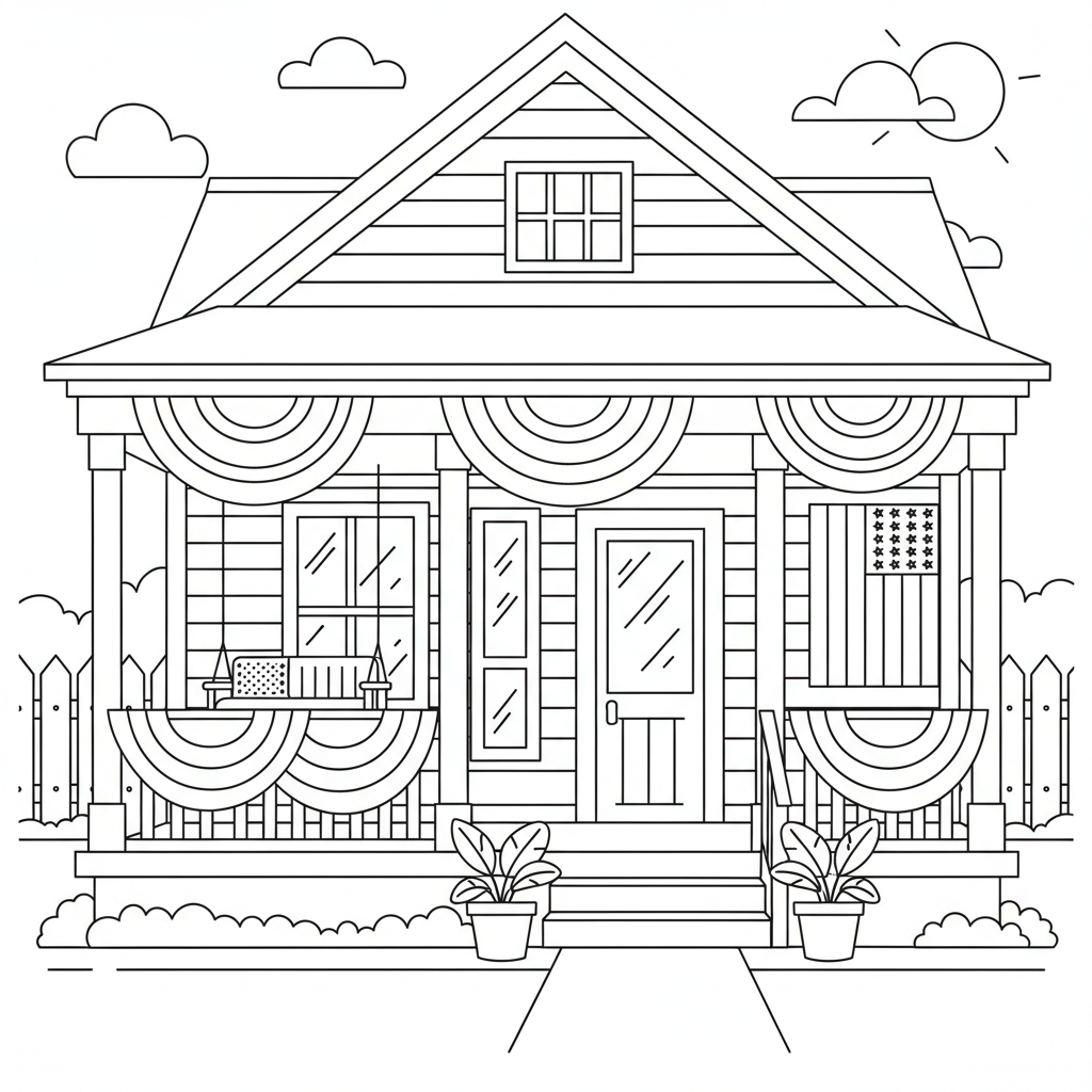A delightful fourth of july coloring page featuring American flag bunting decorating front porch of house. Perfect for kids and adults who love coloring!