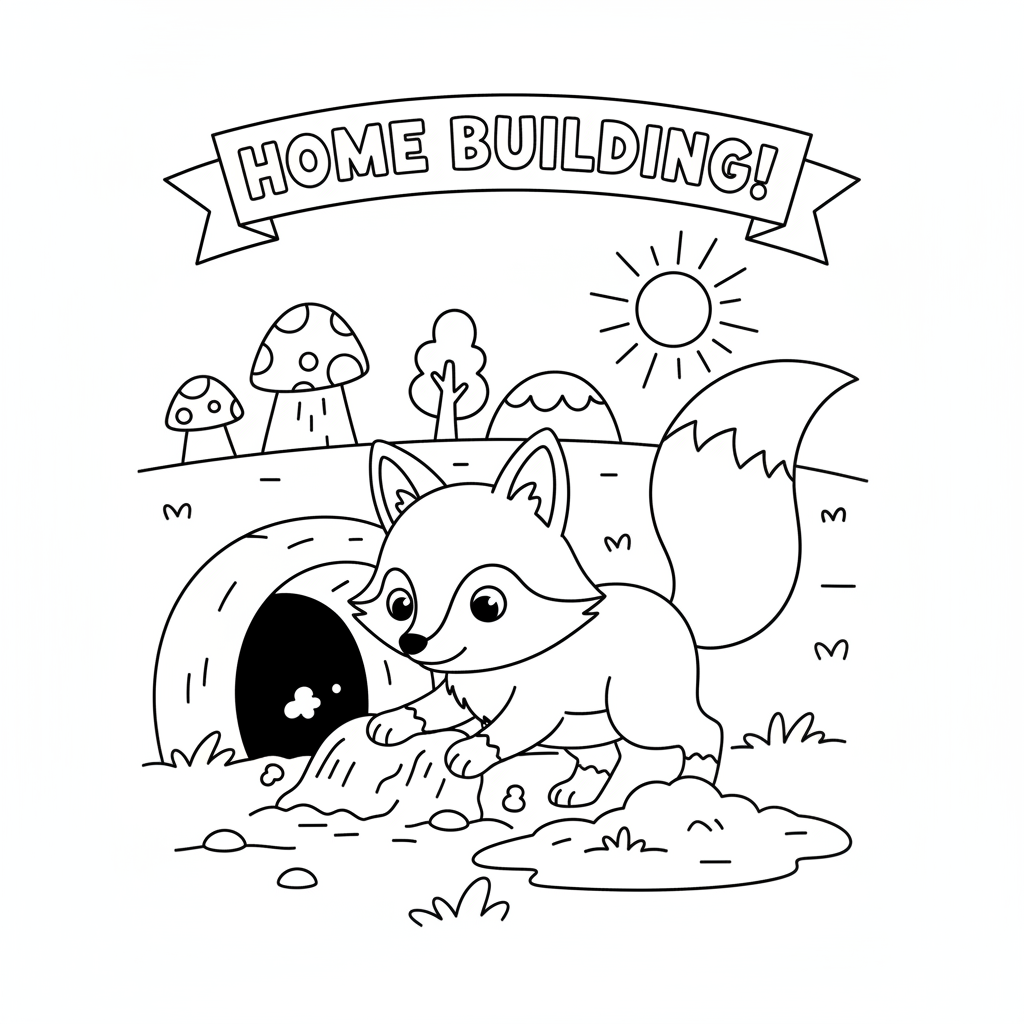 A delightful fox coloring page featuring fox digging burrow entrance busy paws home building. Perfect for kids and adults who love coloring!