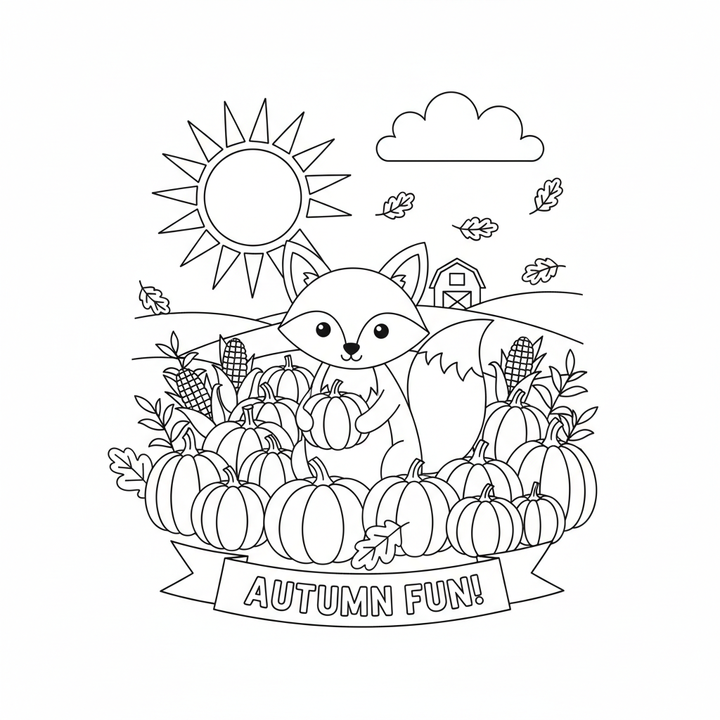 A delightful fox coloring page featuring fox pumpkin patch autumn harvest seasonal scene. Perfect for kids and adults who love coloring!