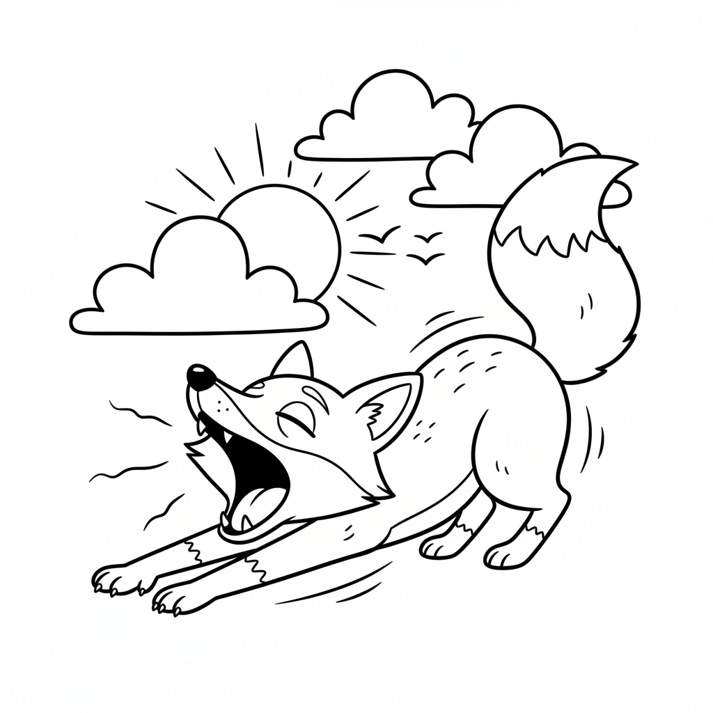 A delightful fox coloring page featuring fox stretching yawning morning sunlight awakening lazy. Perfect for kids and adults who love coloring!