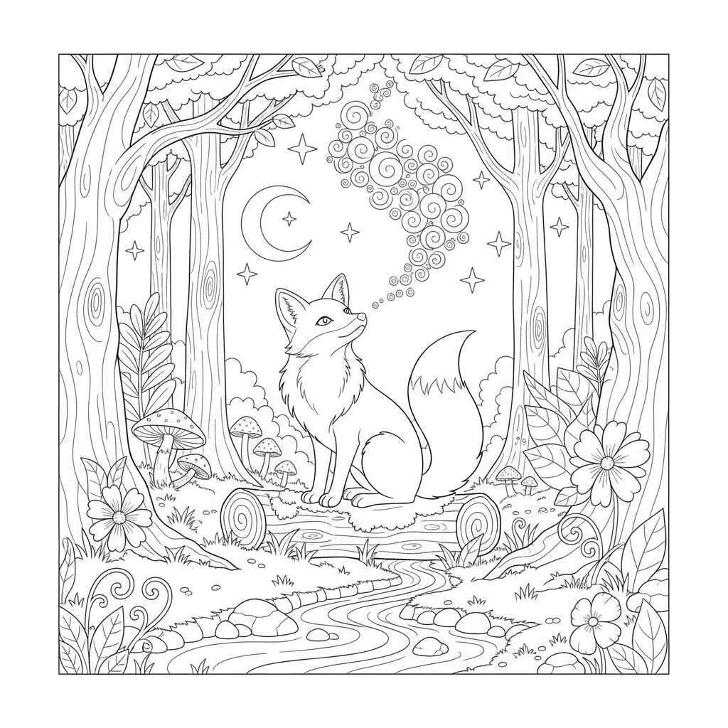 Beautiful fox watching fireflies in magical twilight forest coloring page for kids and adults. Free to download and print.