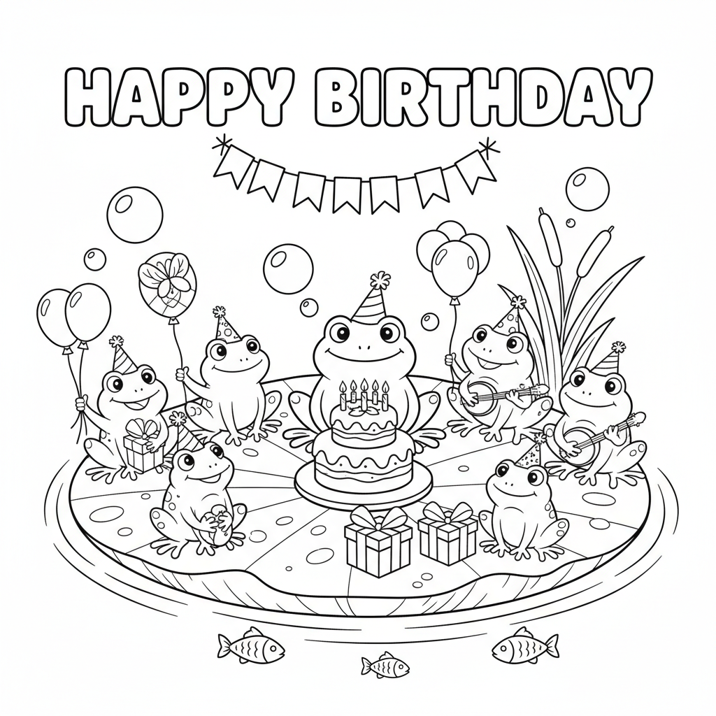 A delightful frog coloring page featuring frog birthday party lily pad celebration. Perfect for kids and adults who love coloring!