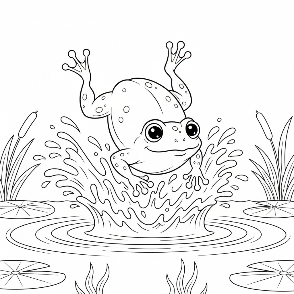Beautiful frog diving into pond splash coloring page for kids and adults. Free to download and print.