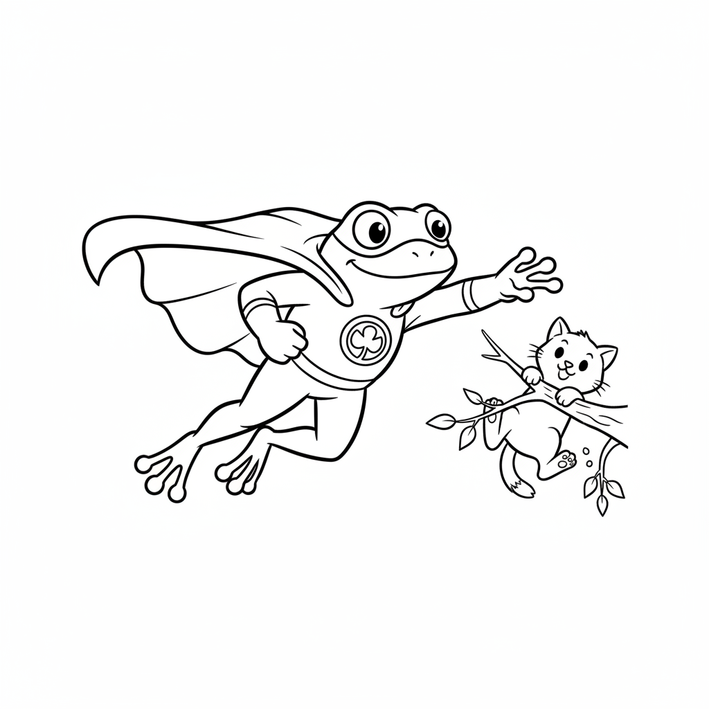 A delightful frog coloring page featuring frog superhero cape flying rescue hero. Perfect for kids and adults who love coloring!