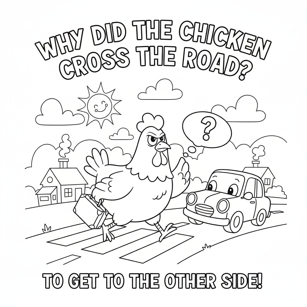 A delightful funny coloring page featuring chicken crossing the road classic joke illustration scene. Perfect for kids and adults who love coloring!