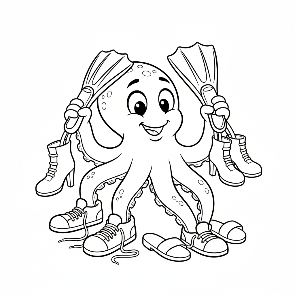 A delightful funny coloring page featuring octopus trying to put on four pairs of shoes. Perfect for kids and adults who love coloring!