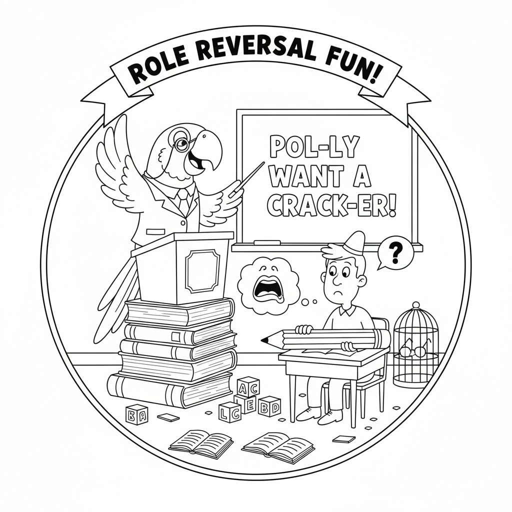 A delightful funny coloring page featuring parrot teaching a human to talk role reversal funny. Perfect for kids and adults who love coloring!