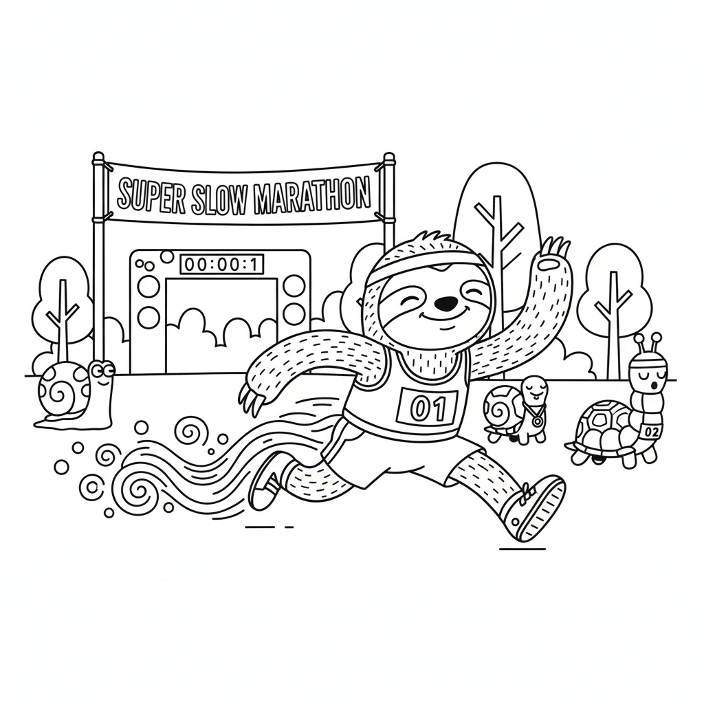 A delightful funny coloring page featuring sloth running a marathon in super slow motion race. Perfect for kids and adults who love coloring!
