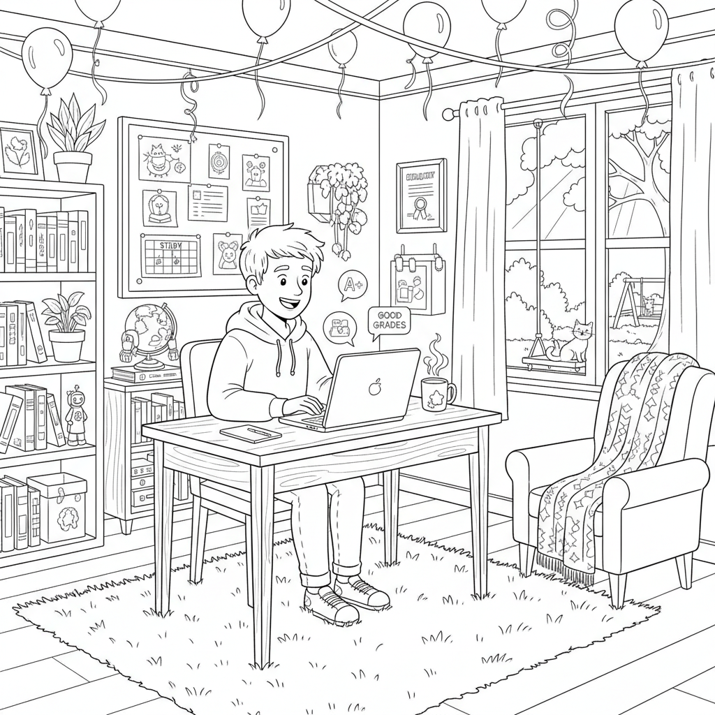 a high school teenager taking online college classes in a classroom that is homey and cheerful and f