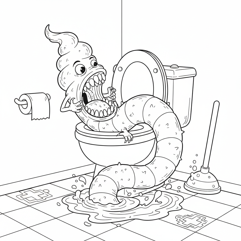 A toilet devouring a thick long piece of poop.