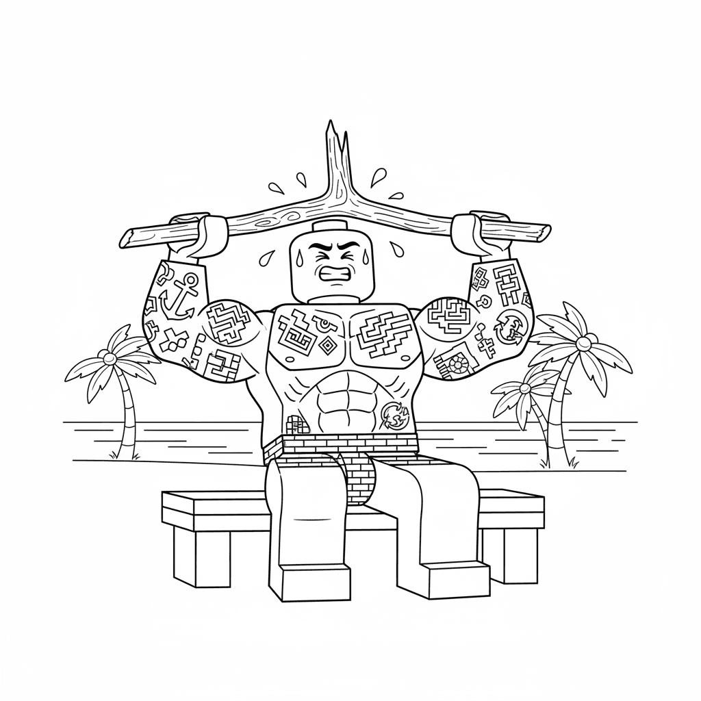 Tall immensely buff lego guy with numerous tattoos in a swimsuit on trying to bench press a stick bu