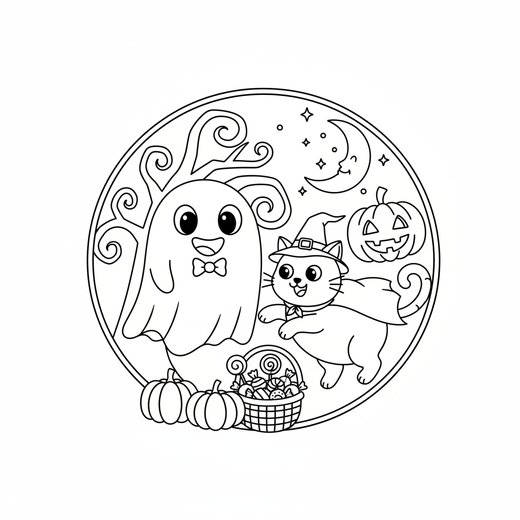 A delightful ghost coloring page featuring ghost and cat friends halloween duo. Perfect for kids and adults who love coloring!