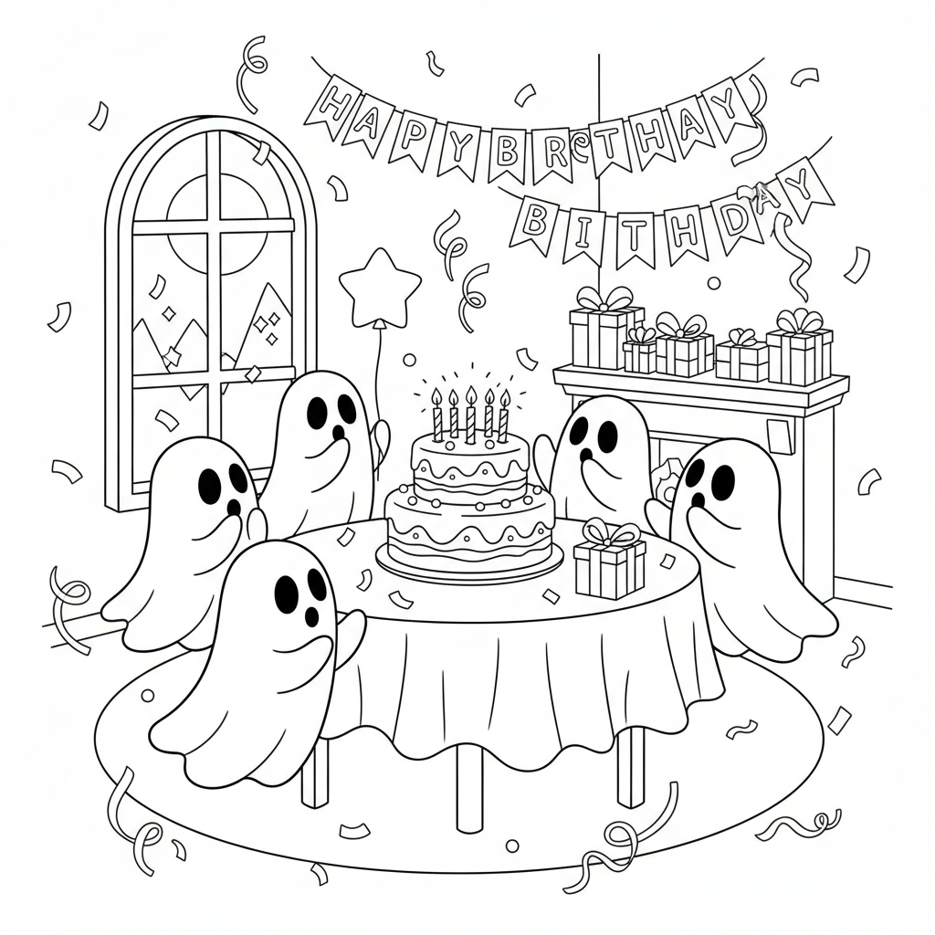 Beautiful ghost birthday celebration coloring page for kids and adults. Free to download and print.