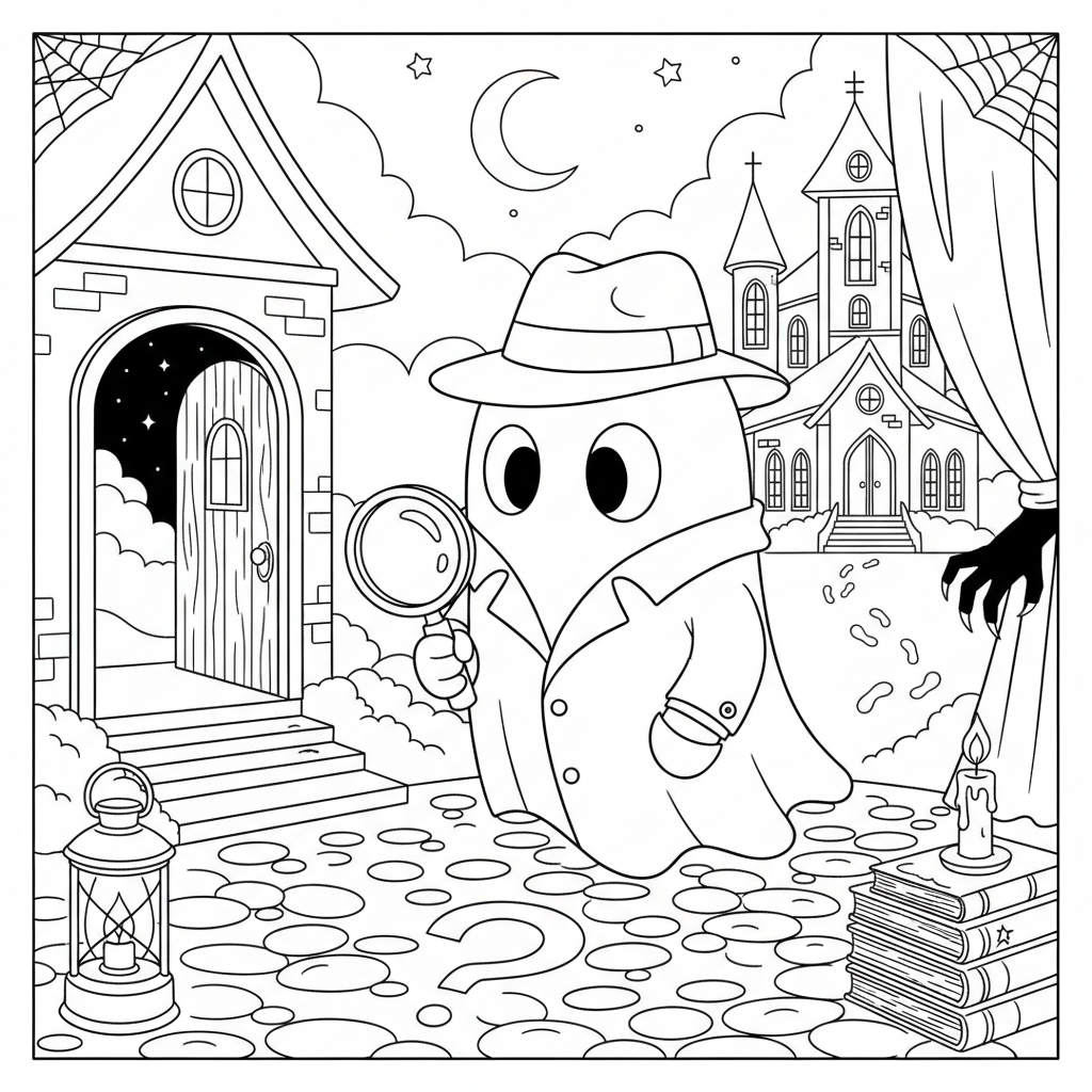 Beautiful ghost detective mystery coloring page for kids and adults. Free to download and print.