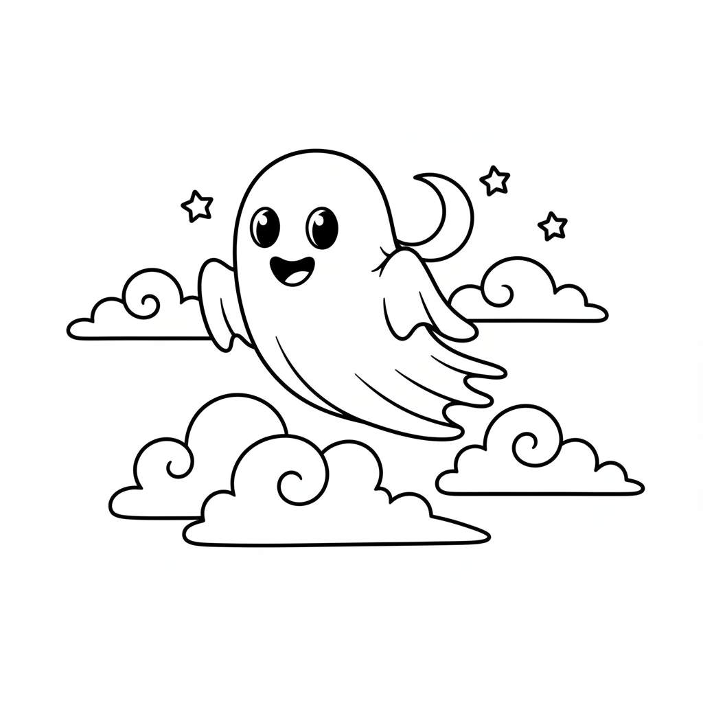 A delightful ghost coloring page featuring ghost flying through cloudy night sky. Perfect for kids and adults who love coloring!