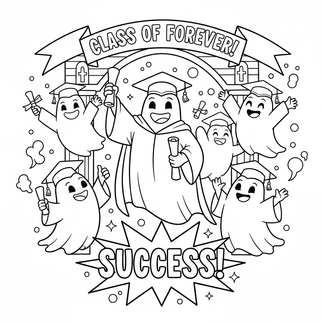 A delightful ghost coloring page featuring ghost graduation ceremony achievement success. Perfect for kids and adults who love coloring!