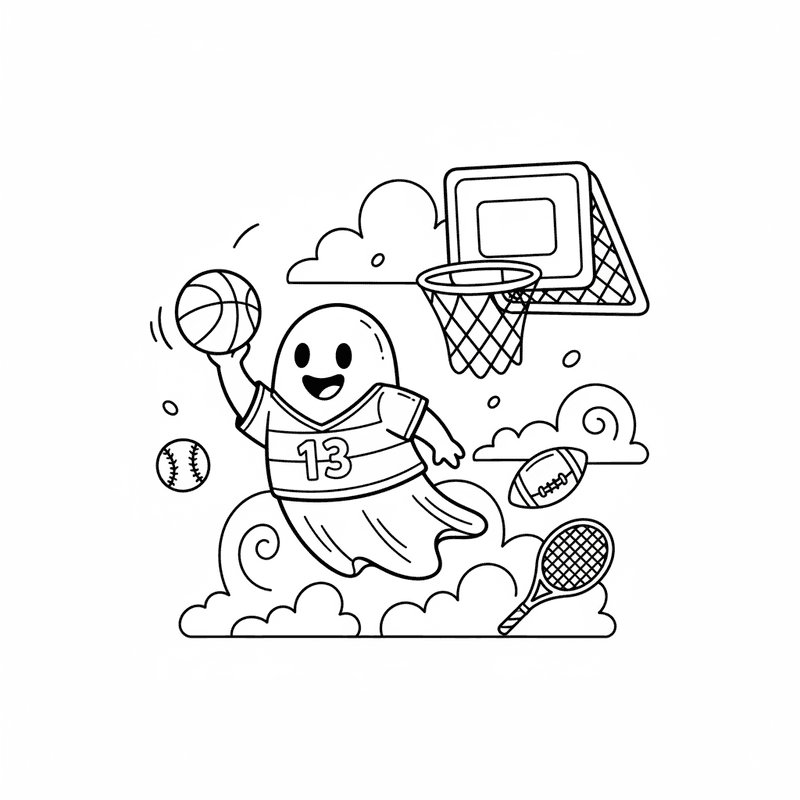 A delightful ghost coloring page featuring ghost playing sports floating goal. Perfect for kids and adults who love coloring!