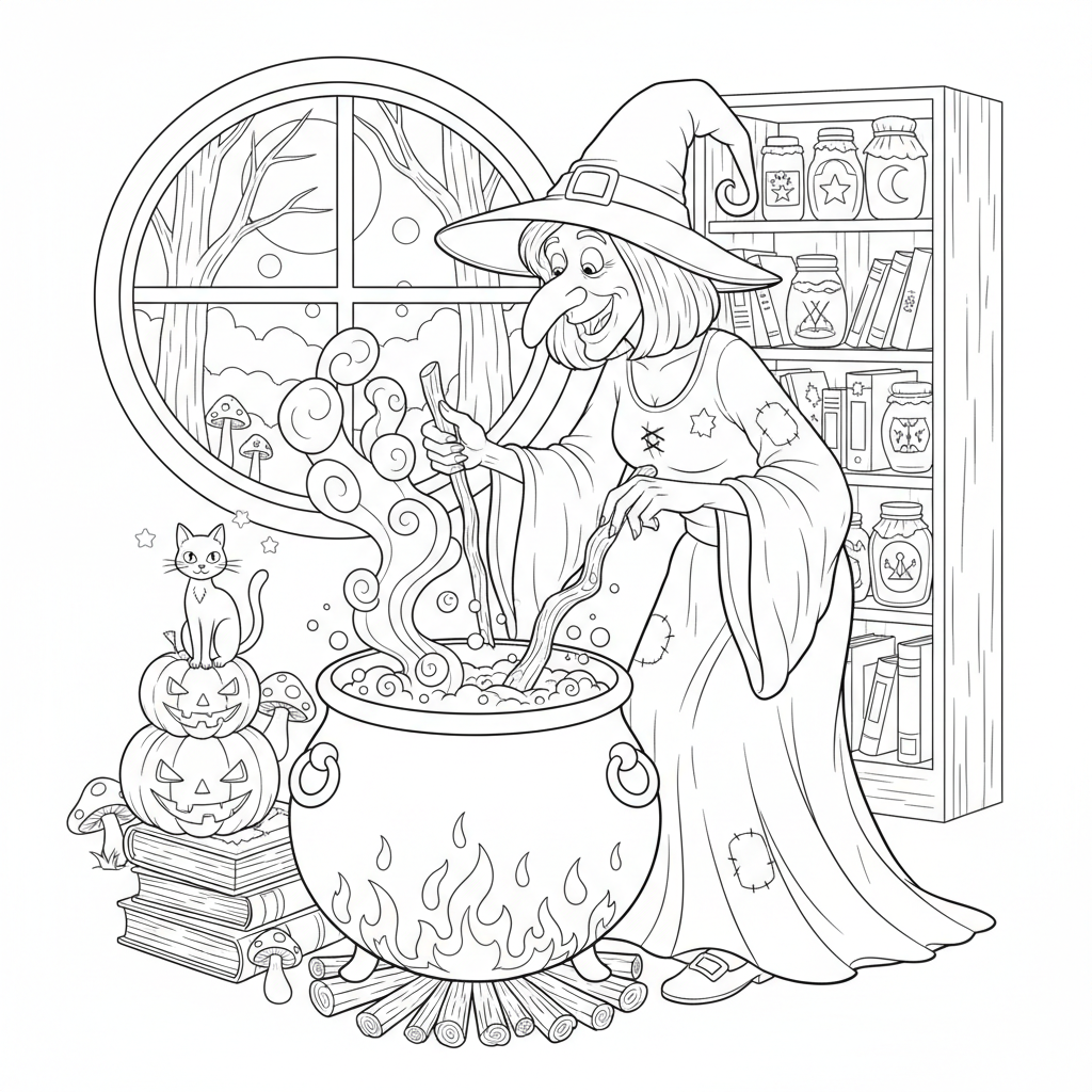 Beautiful cauldron bubbling with potion witch coloring page for kids and adults. Free to download and print.
