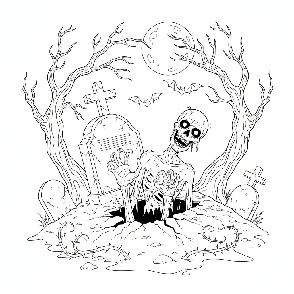 Beautiful zombie rising from grave spooky coloring page for kids and adults. Free to download and print.