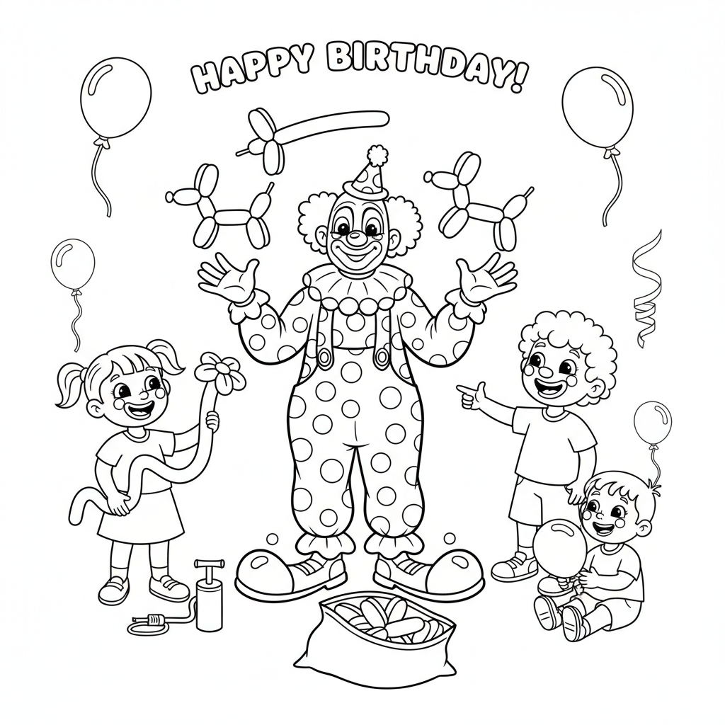 A delightful happy birthday coloring page featuring birthday clown making balloon animals for kids performer. Perfect for kids and adults who love coloring!