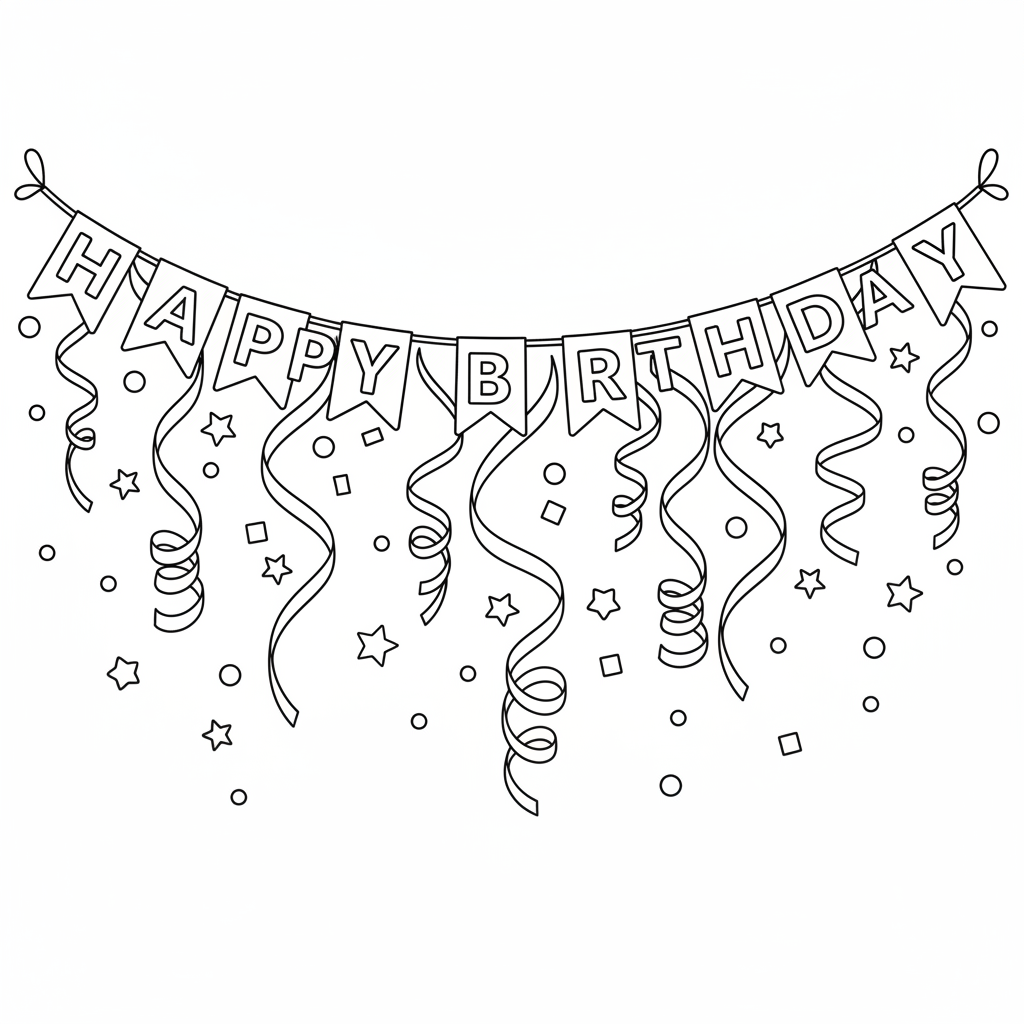 Beautiful happy birthday banner with streamers and confetti falling coloring page for kids and adults. Free to download and print.
