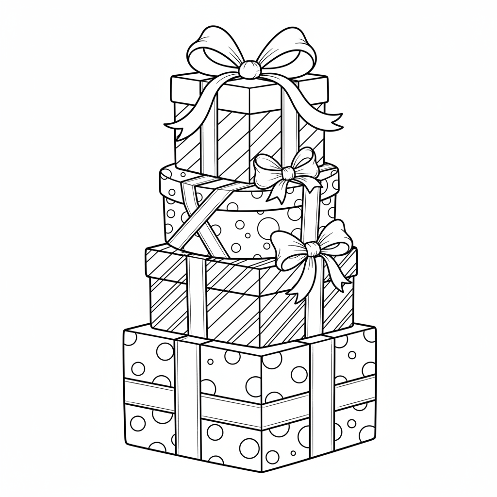 Beautiful stack of wrapped birthday presents with bows and ribbons coloring page for kids and adults. Free to download and print.
