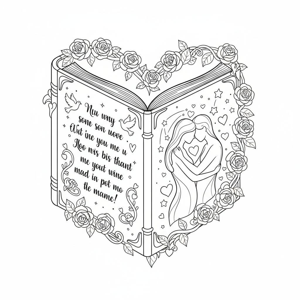 A beautiful open book in a heart shape, adorned with roses, featuring a loving couple embracing. Perfect for romantic souls and those who love heartfelt themes.