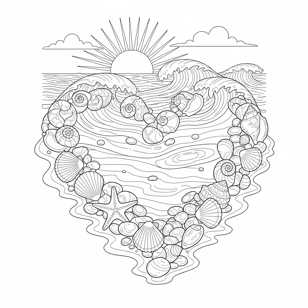 A beautiful heart-shaped design filled with seashells, pebbles, and a starfish, all set against a background of ocean waves and a setting sun. Perfect for nature lovers and romance enthusiasts!