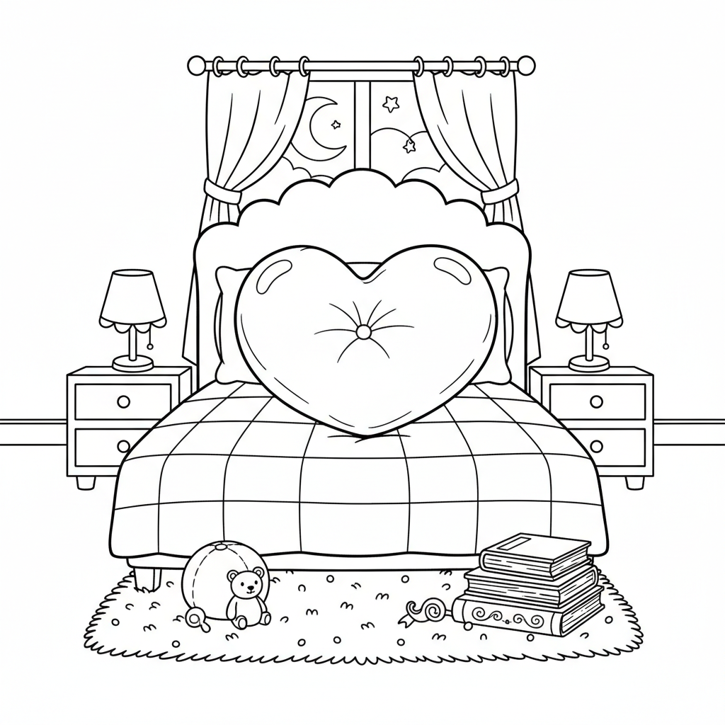 A delightful heart coloring page featuring heart pillow cozy soft bedroom decor. Perfect for kids and adults who love coloring!