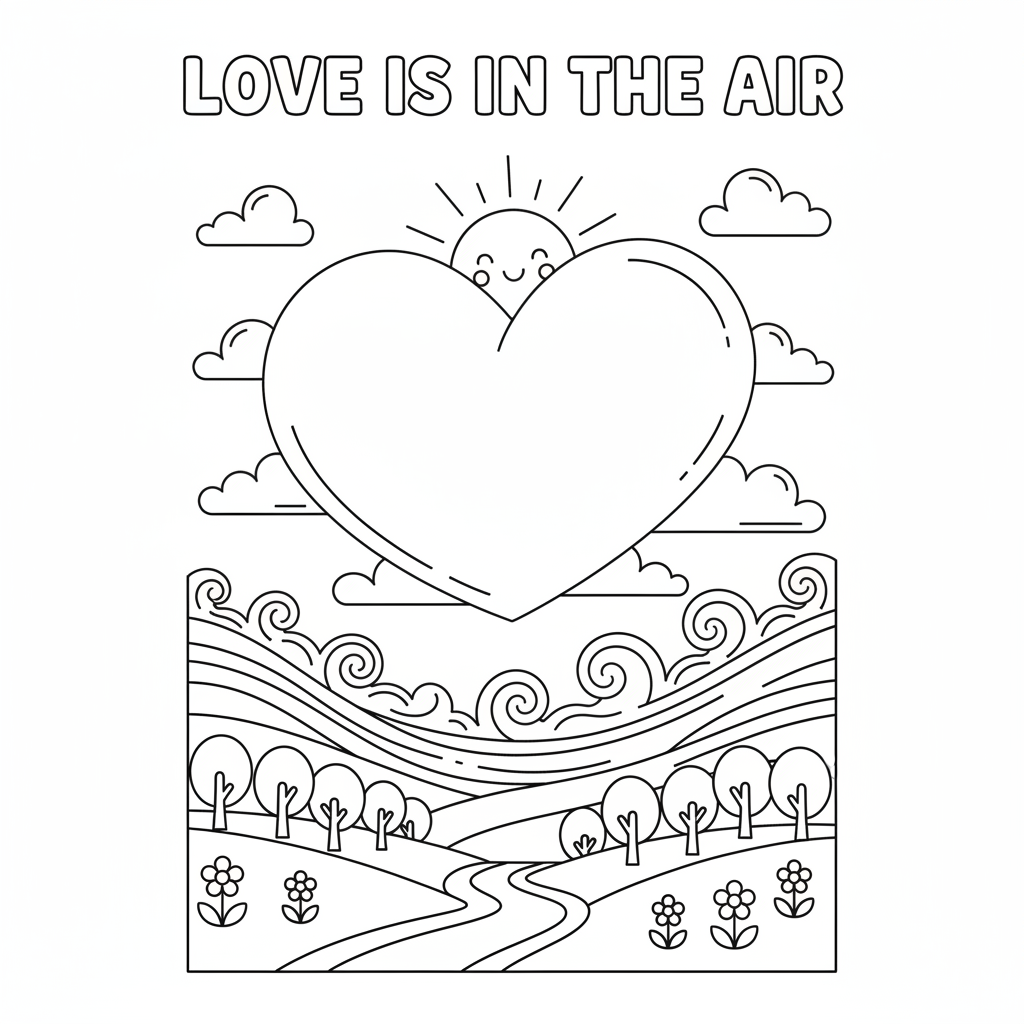 A delightful heart coloring page featuring heart shaped cloud sky formation nature. Perfect for kids and adults who love coloring!