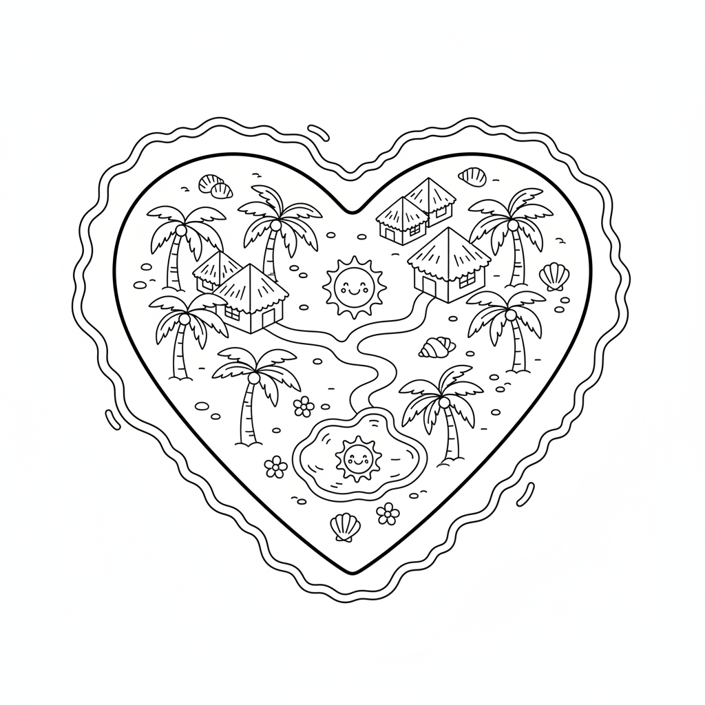 A delightful heart coloring page featuring heart shaped island paradise tropical aerial. Perfect for kids and adults who love coloring!