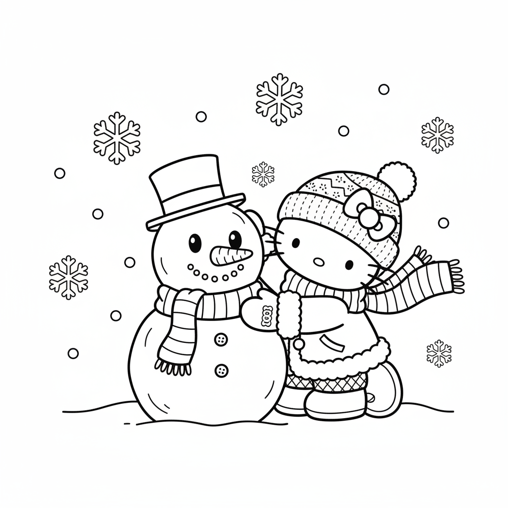A charming coloring page showing Hello Kitty hugging a friendly snowman amidst falling snowflakes. Perfect for kids and fans of cute characters and winter scenes!