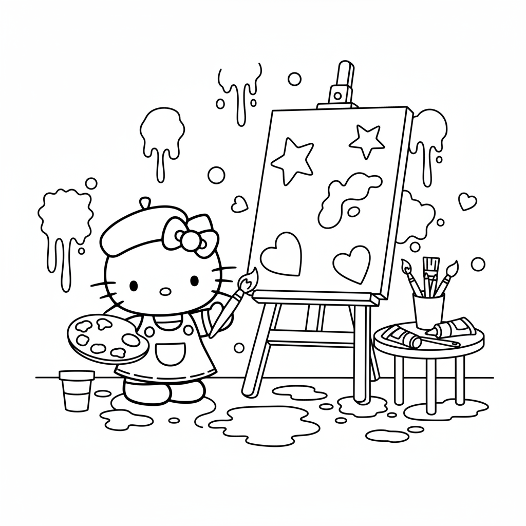 A super cute Hello Kitty paints on an easel, surrounded by brushes and paint splatters! Perfect for creative kids and Hello Kitty fans.